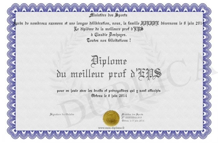 Envoyez par email votre Diplôme du meilleur prof d'EPS personalisé