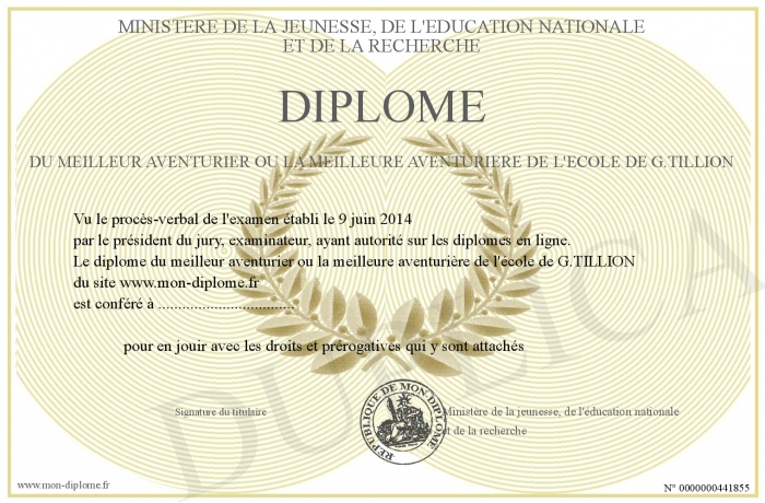 Envoyez par email votre diplôme du meilleur aventurier ou la meilleure aventurière de l'école de G.TILLION personalisé