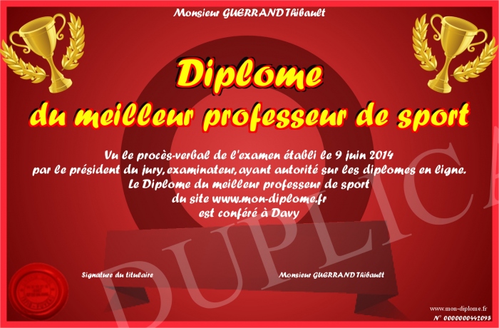 Envoyez par email votre Diplôme du meilleur professeur de sport personalisé