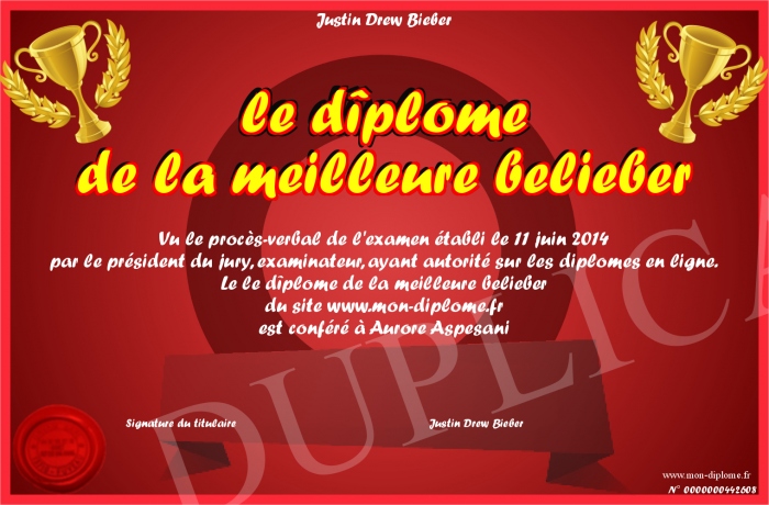 Envoyez par email votre le dîplome de la meilleure belieber personalisé