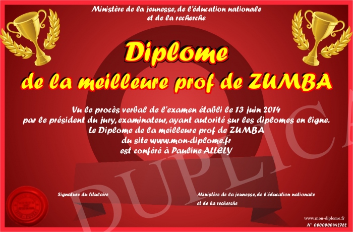 Envoyez par email votre Diplôme de la meilleure prof de ZUMBA personalisé