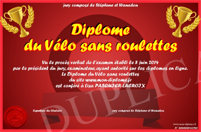 Envoyez par email votre Diplôme du Vélo sans roulettes personalisé