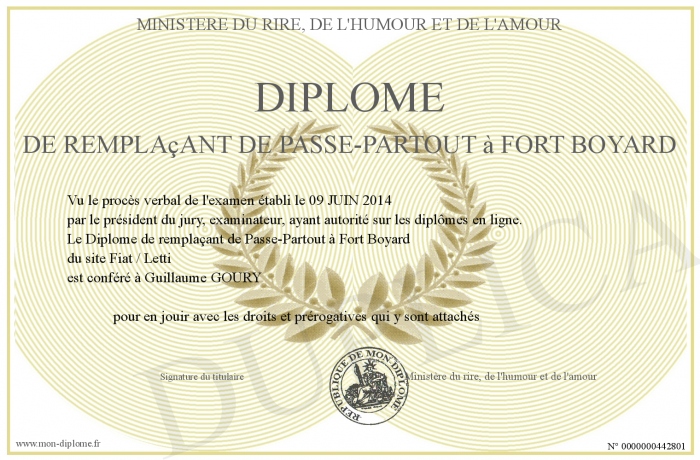 Envoyez par email votre Diplôme de remplaçant de Passe-Partout à Fort Boyard personalisé