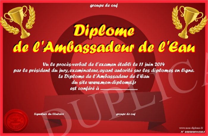 Envoyez par email votre Diplôme de l'Ambassadeur de l'Eau personalisé