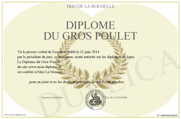 Envoyez par email votre Diplôme du Gros Poulet personalisé