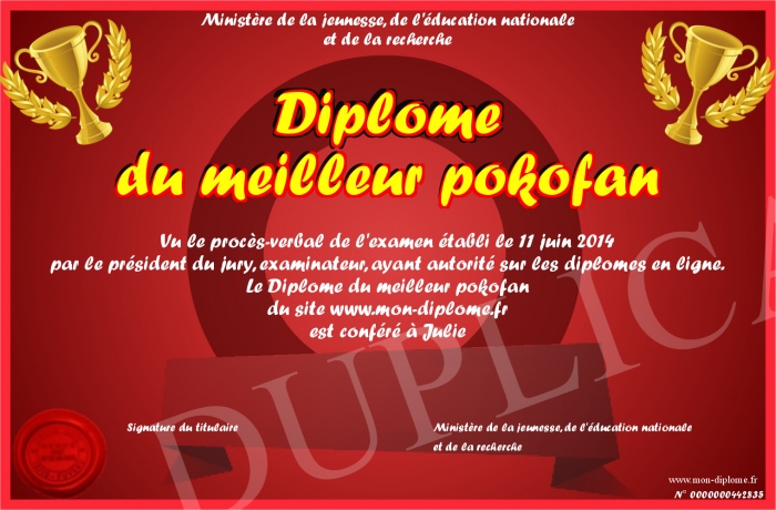 Envoyez par email votre Diplôme du meilleur pokofan personalisé