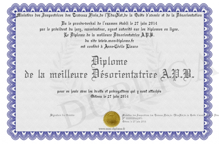 Envoyez par email votre Diplôme de la meilleure Désorientatrice A.P.B. personalisé