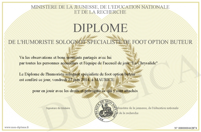 Envoyez par email votre Diplome de l'humoriste solognot spécialiste de foot option buteur personalisé