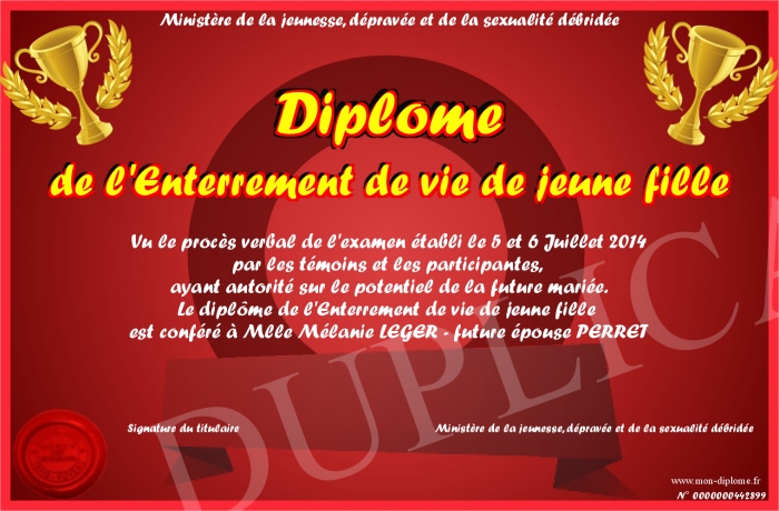 Envoyez par email votre Diplome de l'Enterrement de vie de jeune fille personalisé