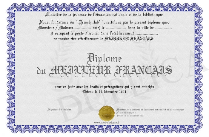 Envoyez par email votre Diplôme du MEILLEUR FRANCAIS personalisé