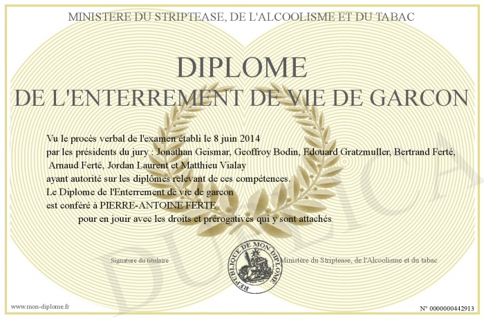 Envoyez par email votre Diplôme de l'Enterrement de vie de garcon personalisé