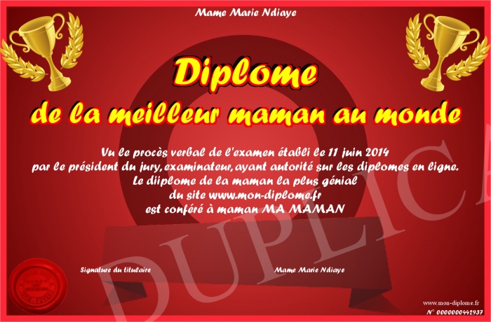 Envoyez par email votre Diplôme de la meilleur maman au monde personalisé