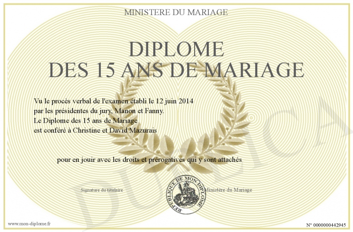 Envoyez par email votre Diplôme des 15 ans de Mariage personalisé
