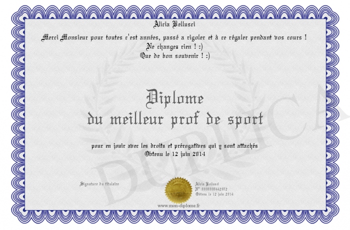 Envoyez par email votre Diplôme du meilleur prof de sport personalisé