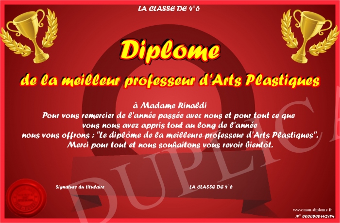 Envoyez par email votre Diplôme de la meilleur professeur d'Arts Plastiques personalisé