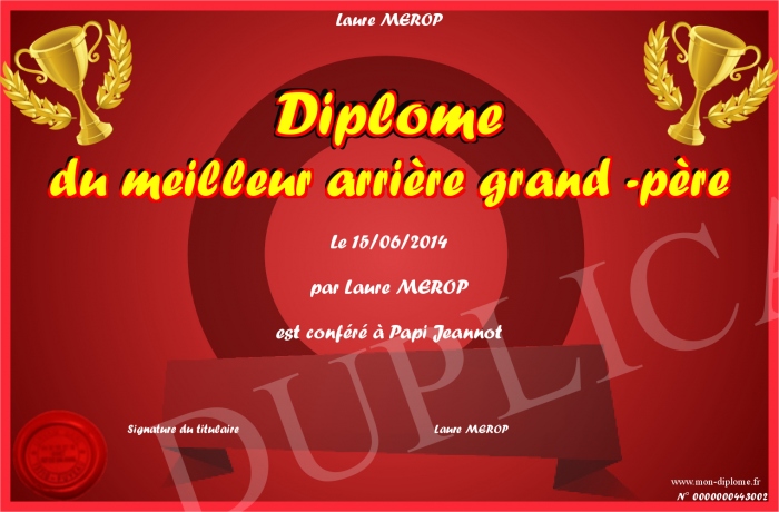 Envoyez par email votre Diplôme du meilleur arrière grand -père personalisé