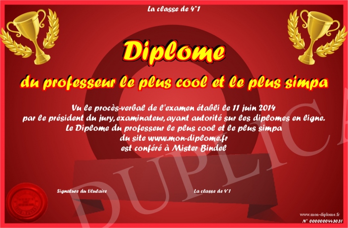 Envoyez par email votre Diplome du professeur le plus cool et le plus simpa personalisé