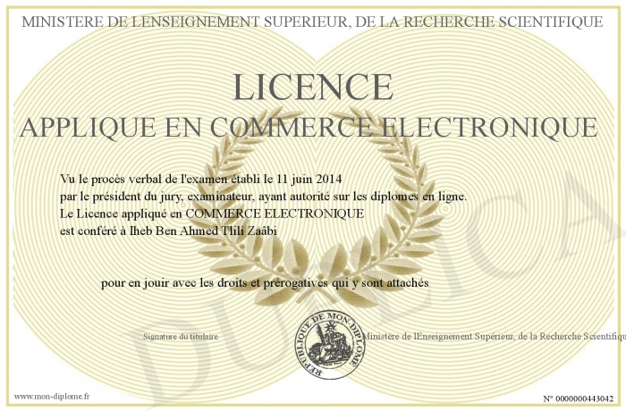 Envoyez par email votre Licence appliqué en COMMERCE ELECTRONIQUE personalisé