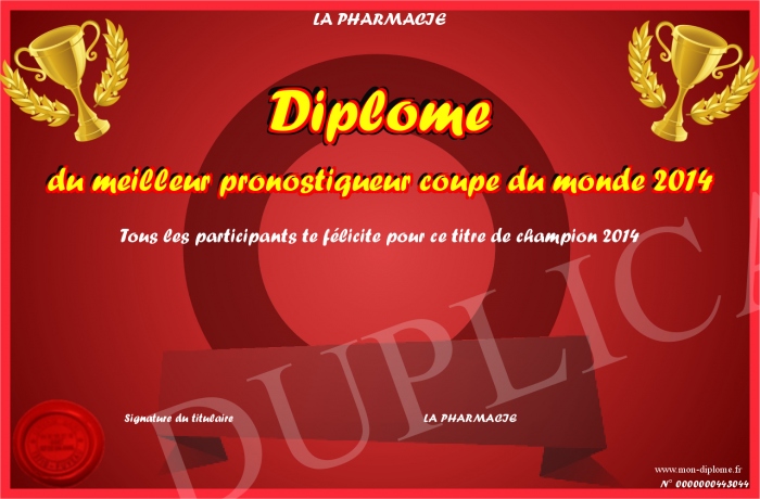 Envoyez par email votre Diplôme du meilleur pronostiqueur coupe du monde 2014 personalisé