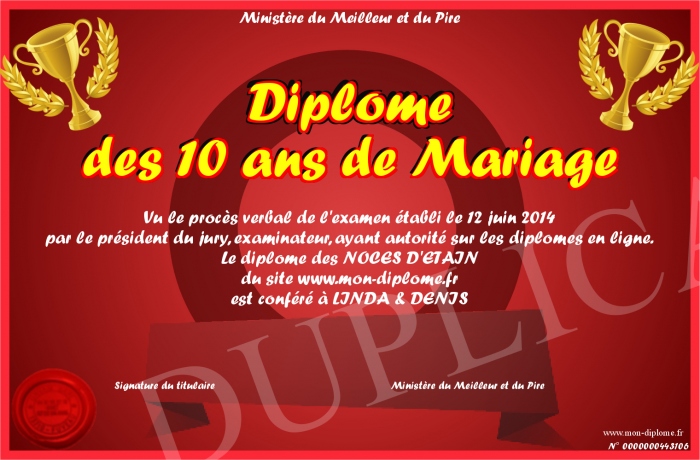 Envoyez par email votre Diplôme des 10 ans de Mariage personalisé