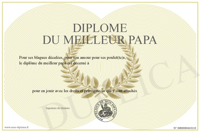 Envoyez par email votre Diplôme du MEILLEUR PAPA personalisé