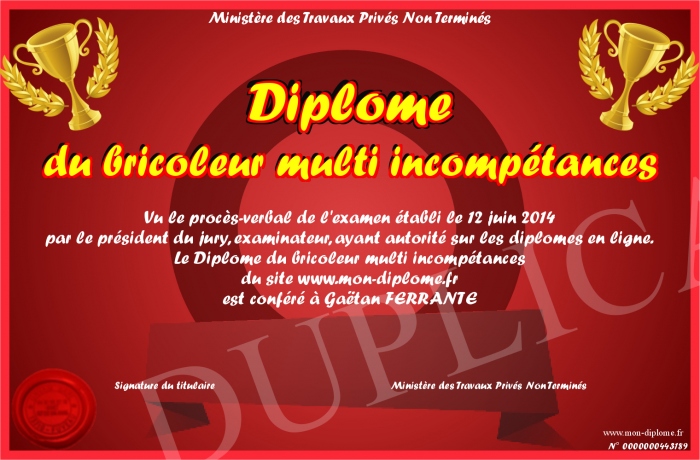 Envoyez par email votre Diplôme du bricoleur multi incompétances personalisé