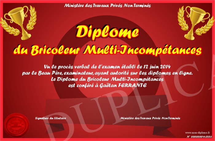 Envoyez par email votre Diplôme du Bricoleur Multi-Incompétances personalisé