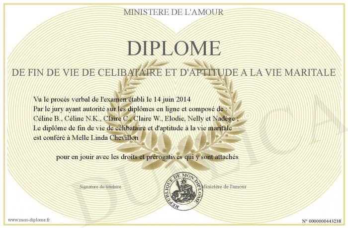 Envoyez par email votre Diplome de fin de vie de célibataire et d'aptitude a la vie maritale personalisé