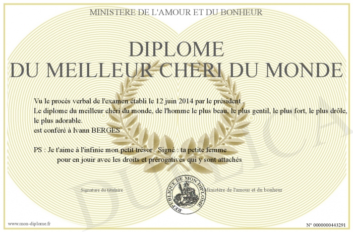 Envoyez par email votre Diplôme du meilleur chéri du monde personalisé