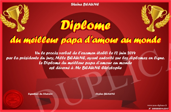 Envoyez par email votre Diplôme du meilleur papa d'amour au monde personalisé