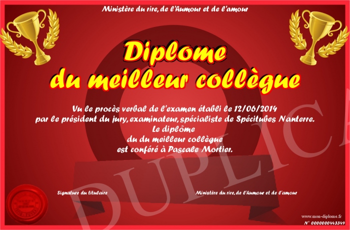 Envoyez par email votre Diplome du meilleur collègue personalisé