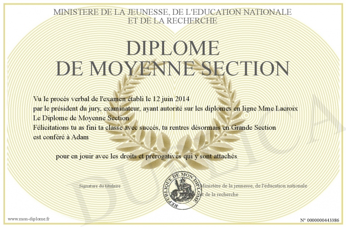 Envoyez par email votre Diplôme de Moyenne Section personalisé