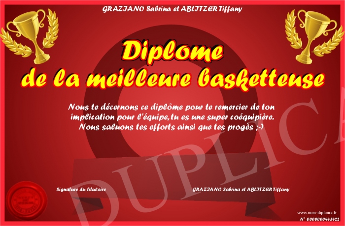Envoyez par email votre Diplôme de la meilleure basketteuse personalisé