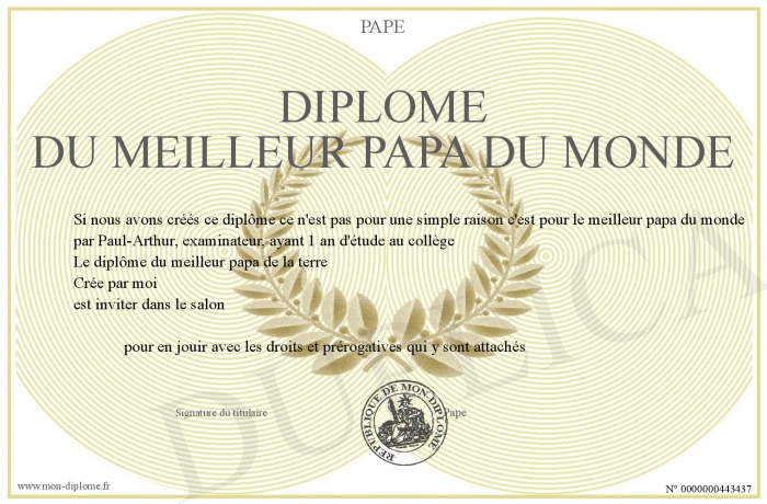 Envoyez par email votre Diplôme du meilleur papa du monde personalisé