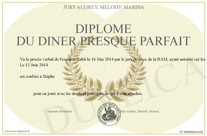 Envoyez par email votre Diplôme du Diner Presque Parfait personalisé