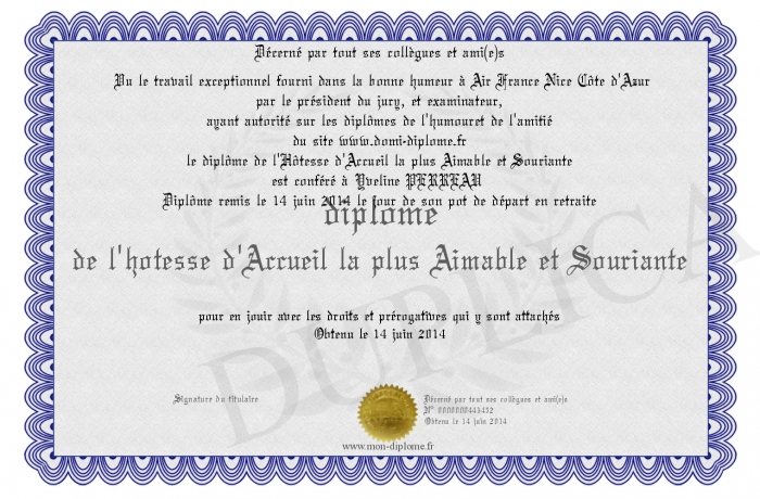 Envoyez par email votre diplôme de l'hôtesse d'Accueil la plus Aimable et Souriante personalisé