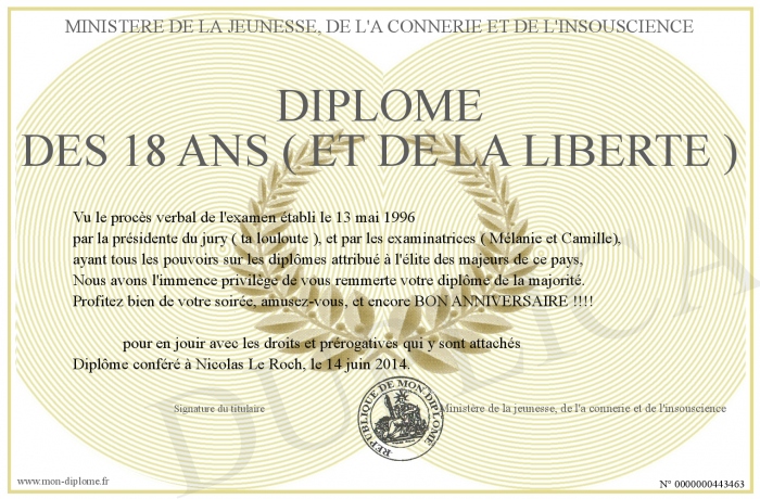 Envoyez par email votre Diplôme des 18 ans ( et de la liberté ) personalisé