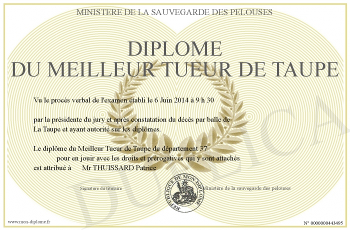 Envoyez par email votre Diplôme du Meilleur Tueur de Taupe personalisé