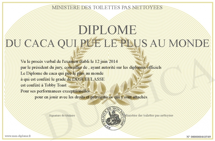 Envoyez par email votre Diplôme du caca qui pue le plus au monde personalisé