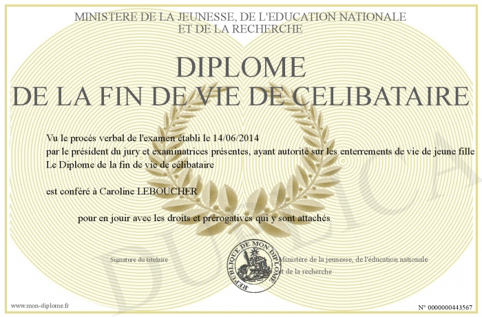 Envoyez par email votre Diplôme de la fin de vie de célibataire personalisé