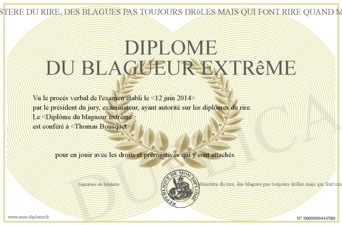 Envoyez par email votre Diplôme du blagueur extrême personalisé