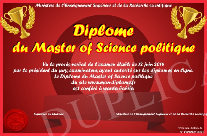 Envoyez par email votre Diplôme du Master of Science politique personalisé