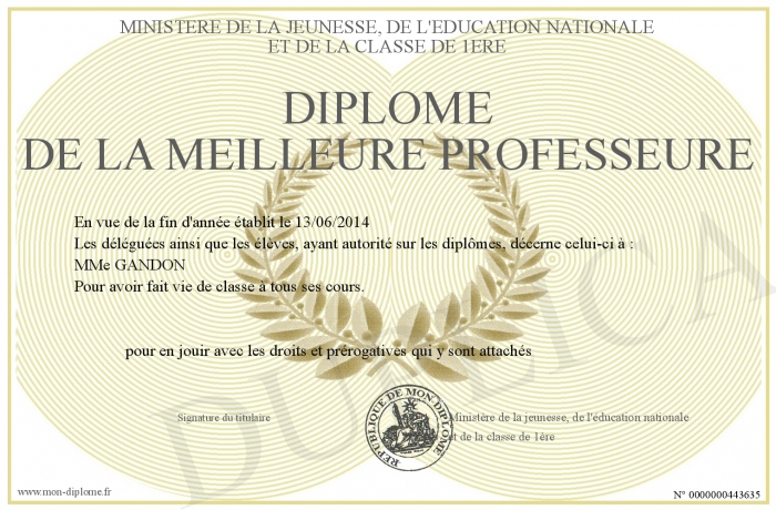 Envoyez par email votre Diplôme de la meilleure professeure personalisé