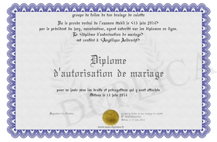 Envoyez par email votre Diplôme d'autorisation de mariage personalisé