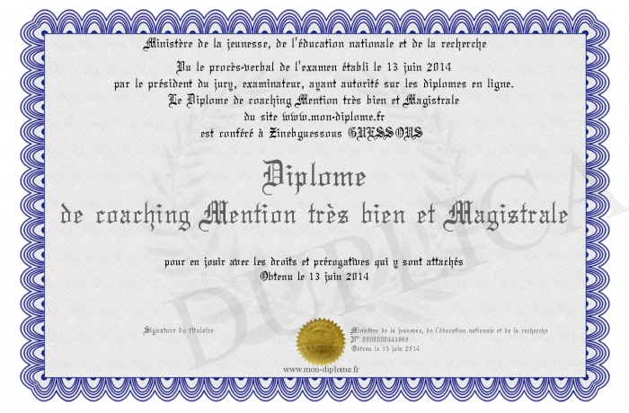Envoyez par email votre Diplôme de coaching Mention très bien et Magistrale personalisé