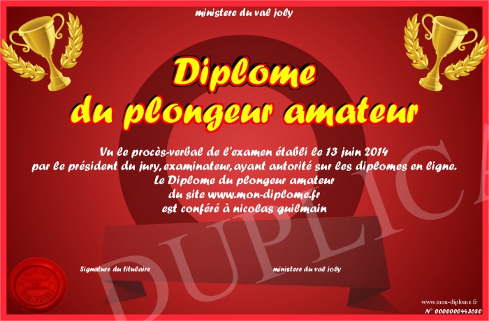 Envoyez par email votre Diplôme du plongeur amateur personalisé