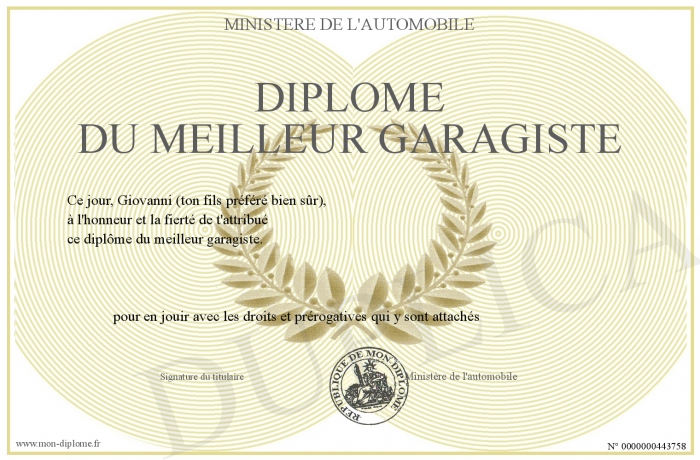 Envoyez par email votre Diplôme du meilleur garagiste personalisé