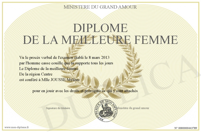 Envoyez par email votre Diplôme de la meilleure femme personalisé