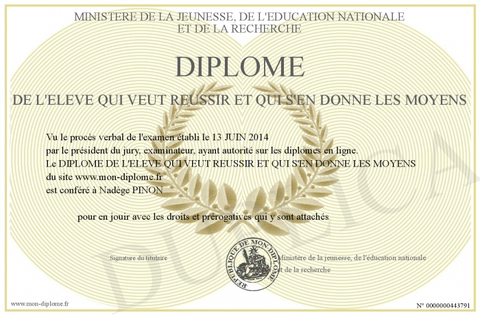 Envoyez par email votre Diplôme de l'élève qui veut réussir et qui s'en donne les moyens personalisé