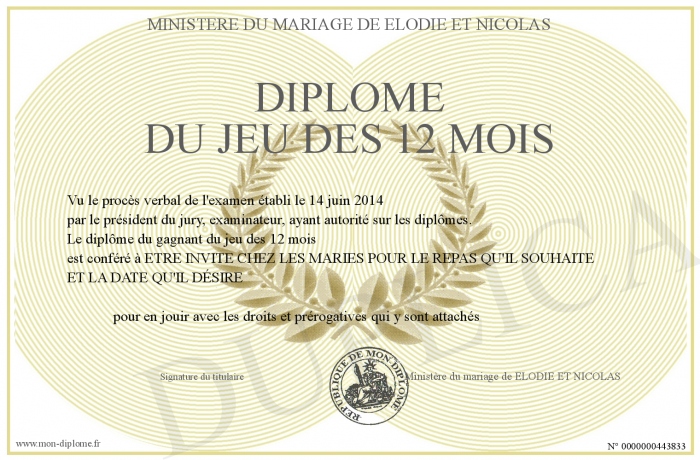 Envoyez par email votre Diplôme du jeu des 12 mois personalisé